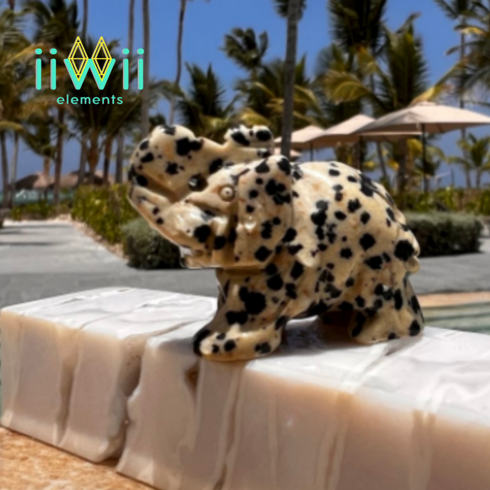 Welcome joy and positivity with our playful Dalmatian Jasper Elephant, expertly crafted to uplift your spirit.